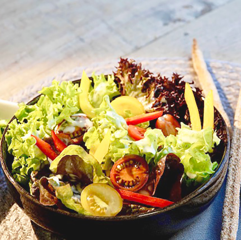 Den bunten Salat waschen und zupfen. Die gelbe und rote Paprika werden in schmale Streifen geschnitten und die Cherry-Tomaten in Viertel geteilt. Alle Zutaten werden auf einen entsprechenden Teller arrangiert und mit Mont Säntis verfeinert.