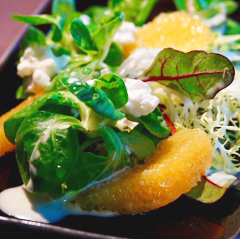 Den Salat waschen und die Orange pellen. Die Orangenfilets vorsichtig herauslösen. Den Salat und die Filets auf dem Teller arrangieren und den Hüttenkäse verteilen. Das Ganze mit Mont Säntis verfeinern.