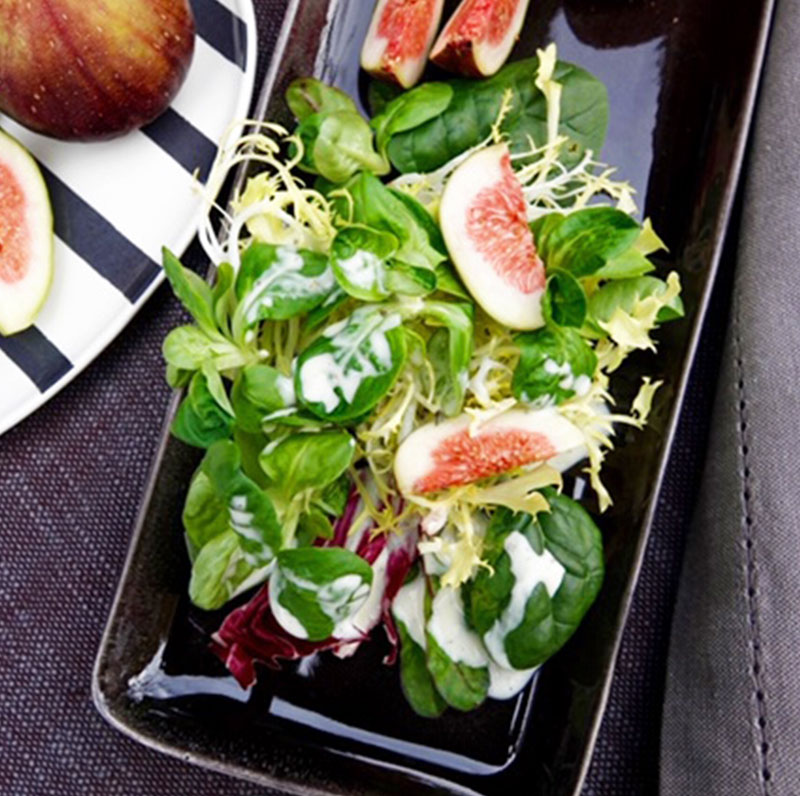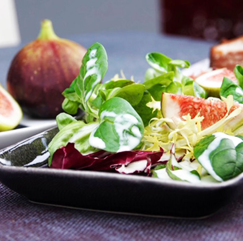 Die verschiedenen Salate waschen und die frischen Feigen in kleine Spalten schneiden. Den Salat und die Feigen auf dem Teller arrangieren und das Ganze mit Mont Säntis verfeinern.