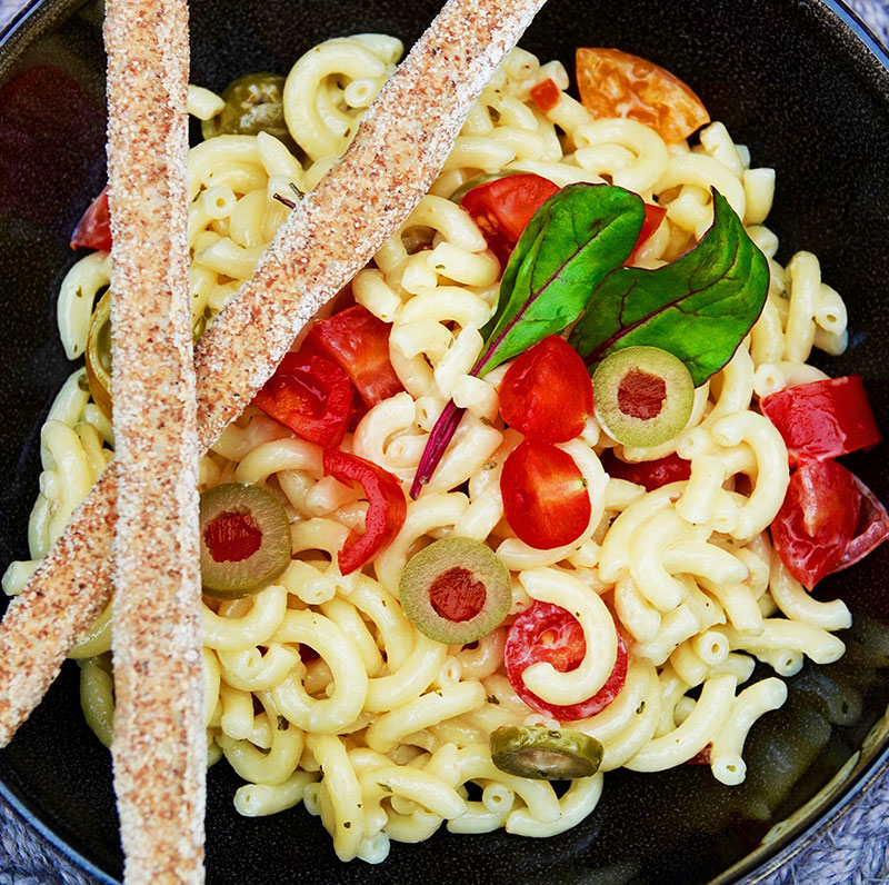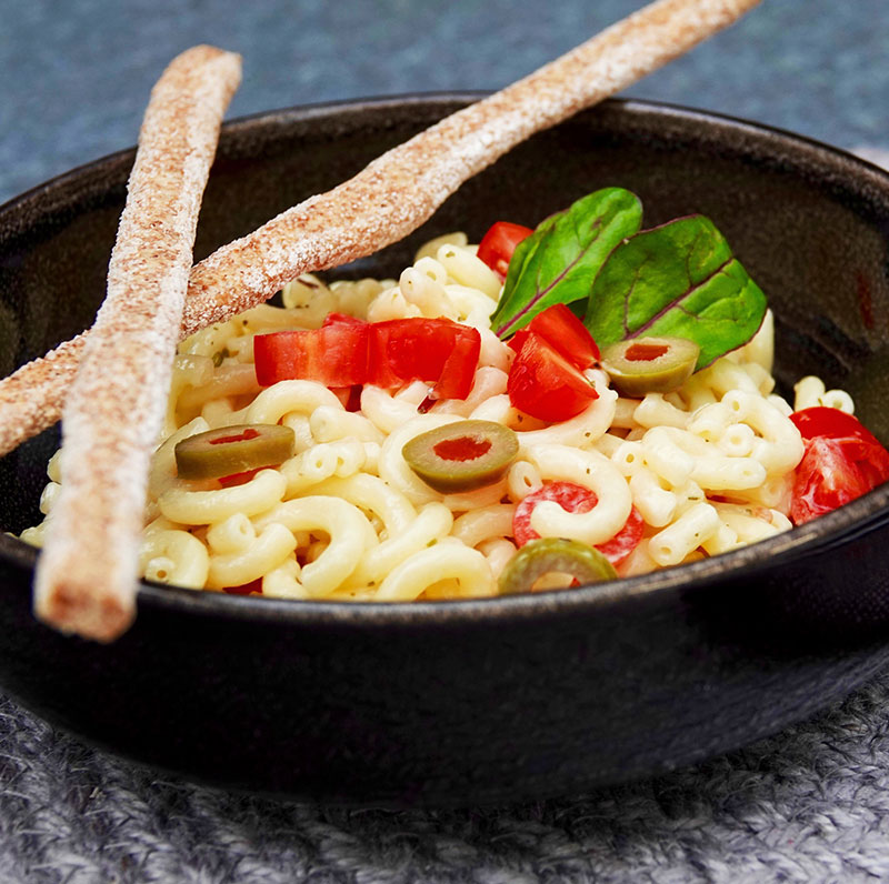 Die Nudeln entsprechend der gewünschten Bissfestigkeit kochen. Die Cherry-Tomaten vierteln und die gefüllten Oliven in kleine Scheiben schneiden. Alle Zutaten durchmengen und auf einen Teller geben. Mont Säntis nach Wunsch über die Nudeln geben.